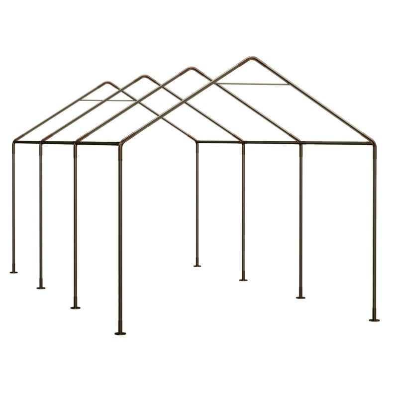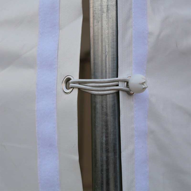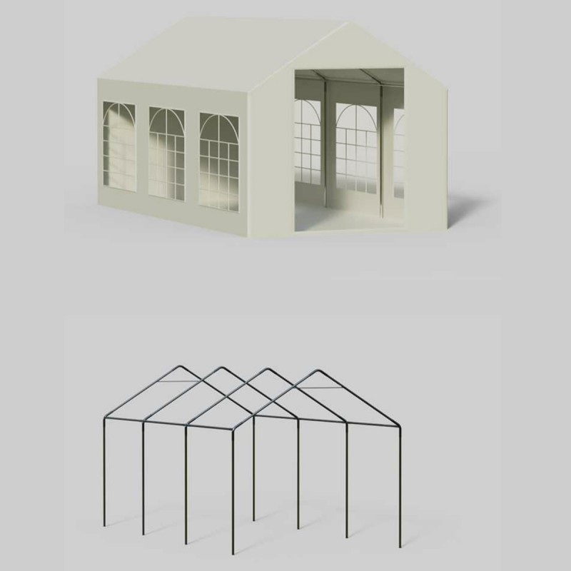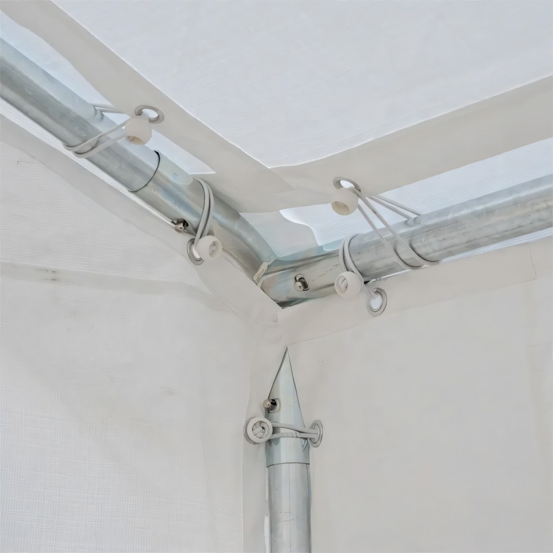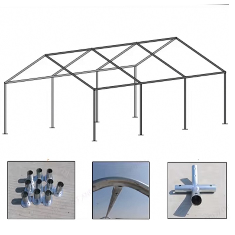 Structura cortului este realizata din tevi din otel galvanizat de Ø38 mm, cu imbinari din teava de Ø42 mm, fixate prin conectori metalici cu suruburi, oferind o stabilitate excelenta chiar si in conditii de utilizare intensiva. Acest sistem constructiv previne deformarile si asigura o utilizare indelungata, fiind ideal atat pentru evenimente temporare, cat si pentru utilizari repetate in sezoane diferite.