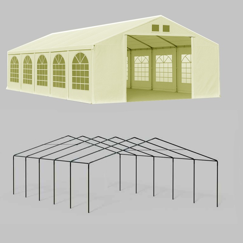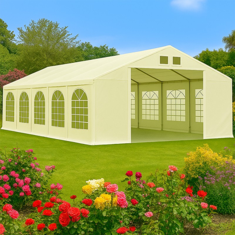 Acoperisul si peretii laterali sunt confectionati din material PE de inalta densitate, de culoare crem (240g/m2), tratat UV si impermeabil. Aceasta prelata durabila ofera protectie optima impotriva soarelui, ploii si vantului, asigurand un spatiu interior sigur, confortabil si placut indiferent de conditiile meteo.