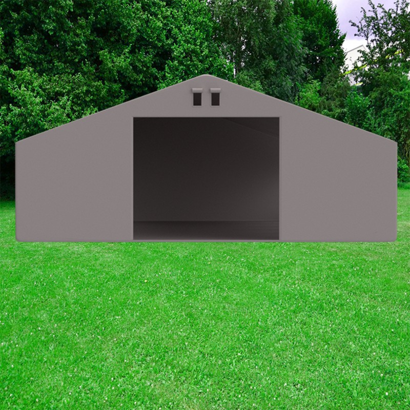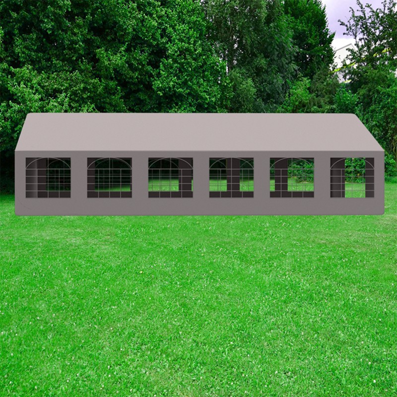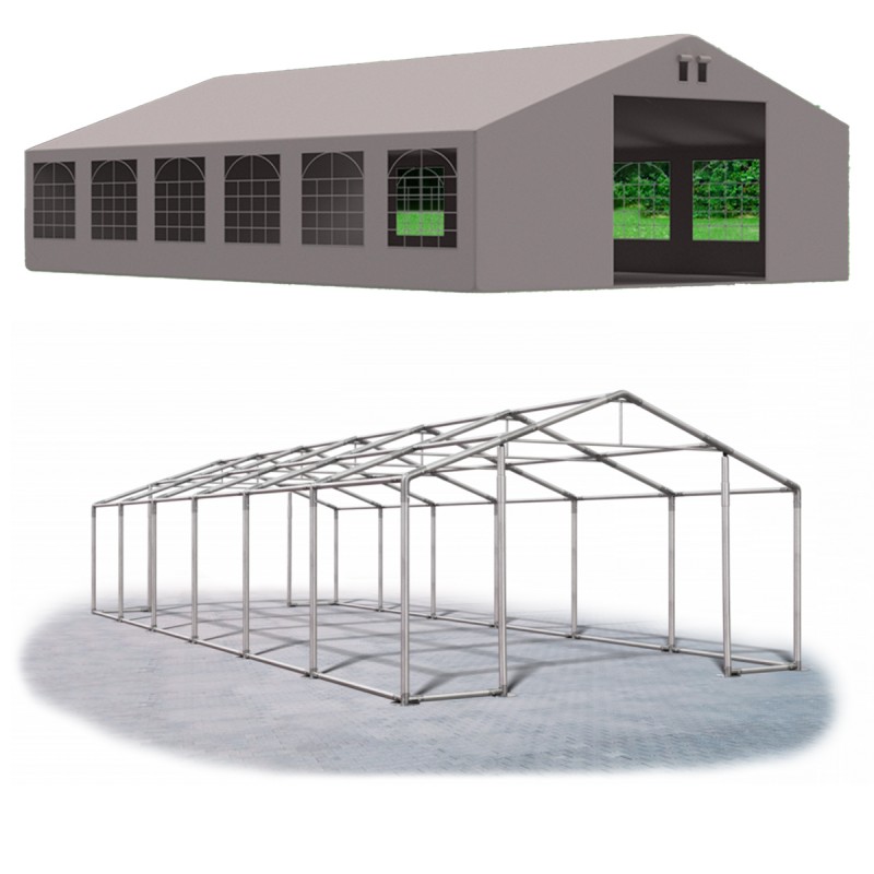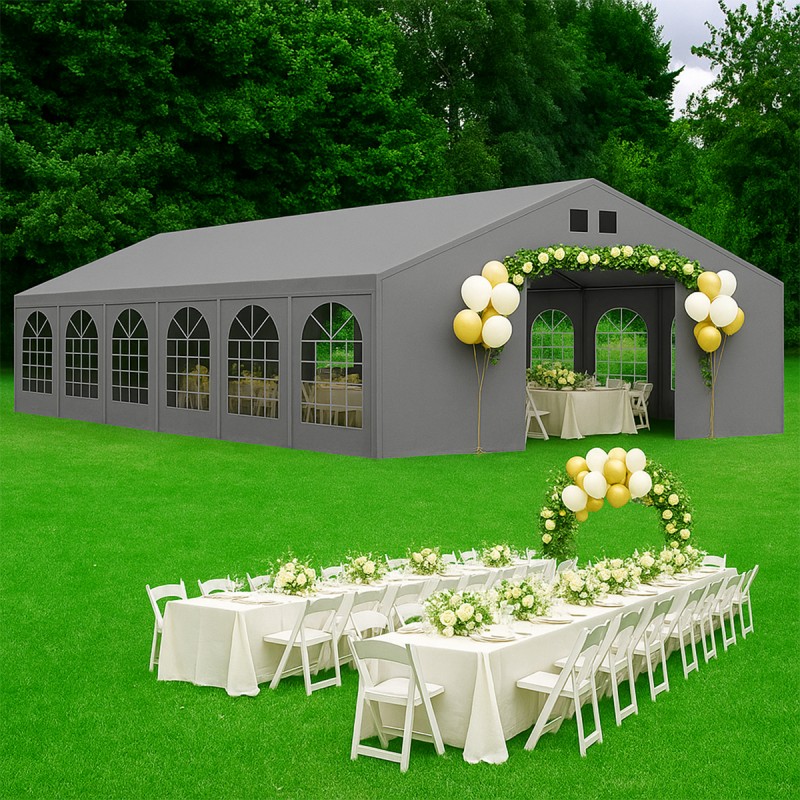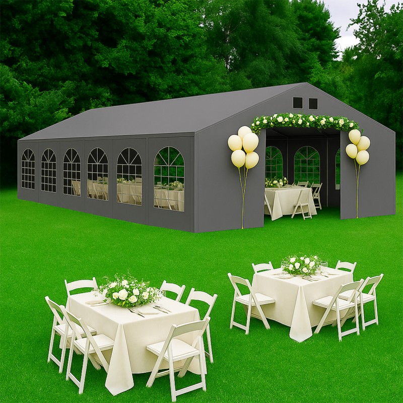 Atat acoperisul, cat si panourile laterale sunt fabricate din PVC gri de inalta calitate, cu o densitate de 560g/m² – un material profesional impermeabil si tratat UV, care ofera protectie excelenta impotriva ploii, vantului si razelor solare. Griul neutru si elegant confera cortului un aspect contemporan si versatil, potrivit atat pentru evenimente formale, cat si pentru ocazii festive.