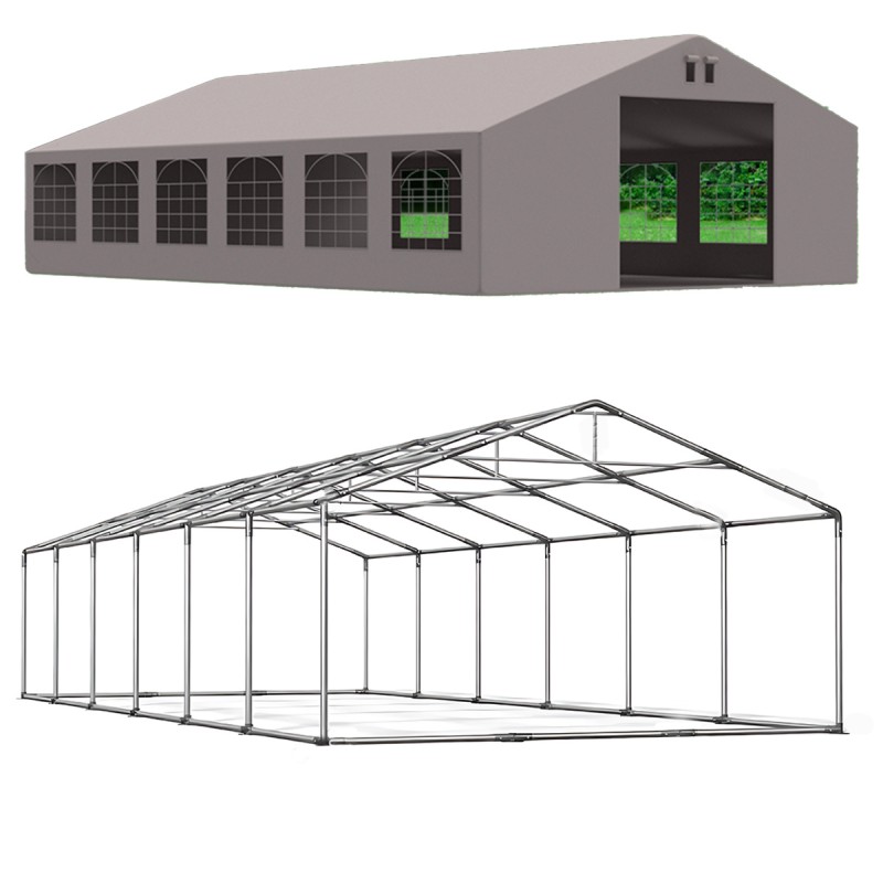 Cadrul cortului este construit din tevi groase de otel galvanizat, cu diametrul de 38 mm si grosime de 1.2 mm, sustinut de conectori metalici intariti cu diametru de 42 mm si grosime de 1.3 mm. Toate conexiunile sunt fixate cu suruburi, oferind un plus de stabilitate si rezistenta in fata vantului, umezelii si uzurii. Sistemul permite instalarea rapida si eficienta, fiind ideal atat pentru utilizare ocazionala, cat si pentru aplicatii permanente.