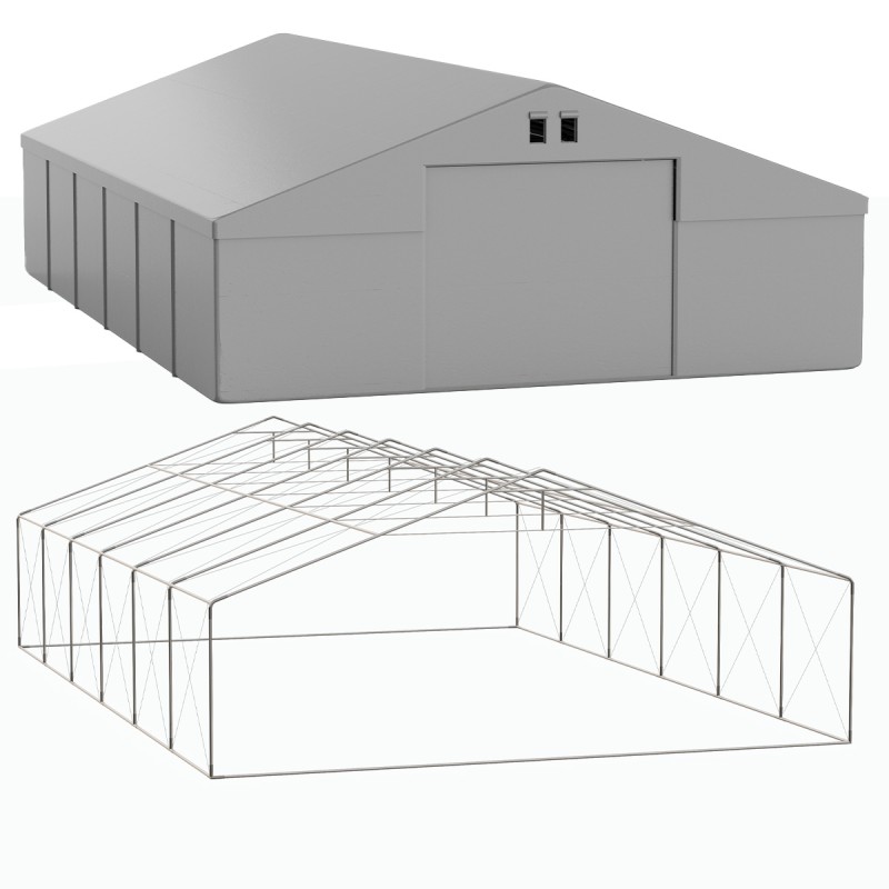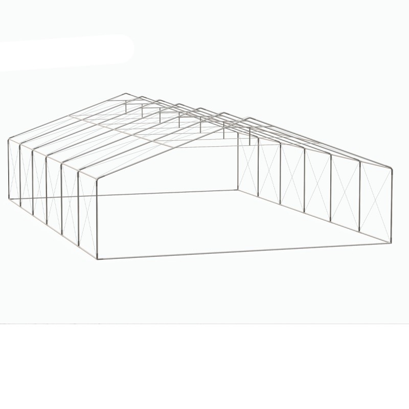 Cadrul este realizat din tevi de otel galvanizat cu diametrul de 38 mm si grosime de 1.2 mm, sustinut de conectori metalici ranforsati cu diametru de 42 mm si grosime de 1.3 mm. Toate imbinarile sunt fixate cu suruburi, oferind o rigiditate structurala remarcabila. Inaltimea laterala de 2 m si inaltimea totala de 3.42 m asigura un volum interior generos, permitand depozitarea de obiecte mari sau circulatia vehiculelor mici.