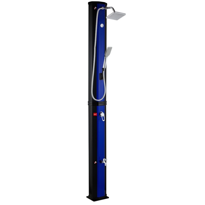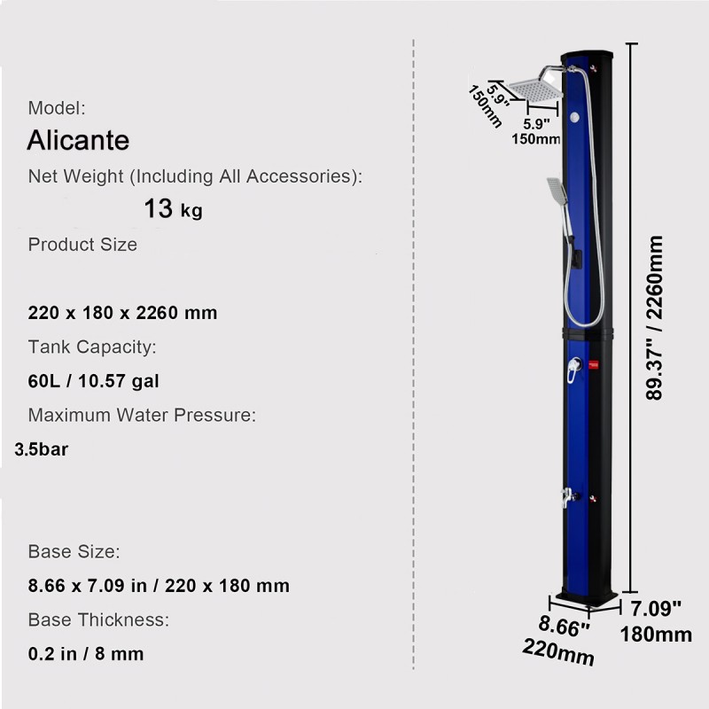 Dus solar 60 Litri, robinet pentru picioare, dus de mana si termometru, cap de dus tip ploaie, PVC+ABS, Albastru Negru, Alicante