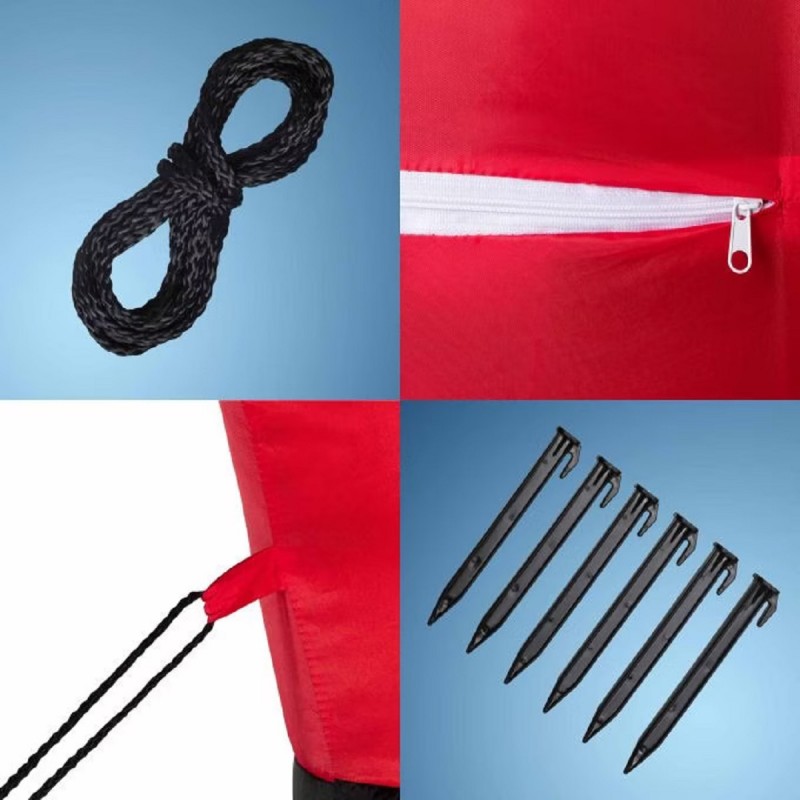 Sistemul autogonflabil permite umflarea figurinei in cateva minute, iar accesoriile de fixare – sacul de nisip cusut, tarusurile si funiile – asigura stabilitate perfecta in orice spatiu. -