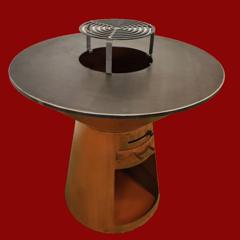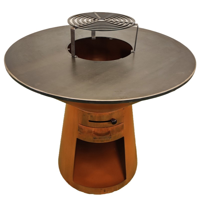 Gratar pe lemn cu plita mare si blat din lemn din stejar alb, spatiu pentru lemne, otel corten 2 mm, dia 100xH 90 cm, Avangarde