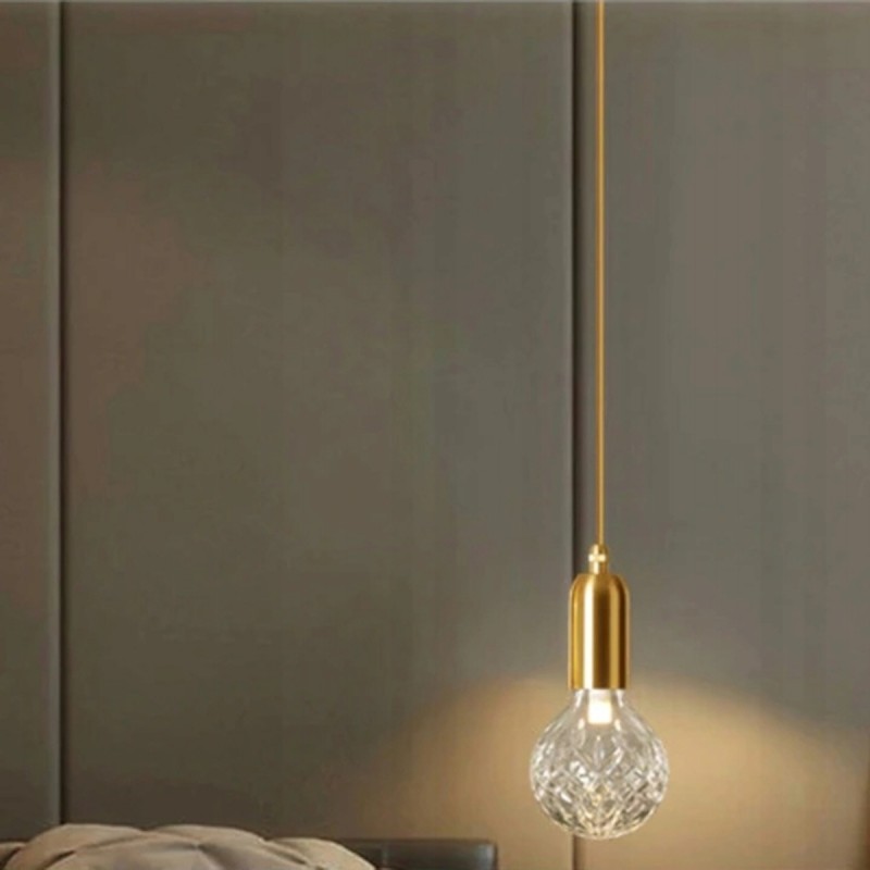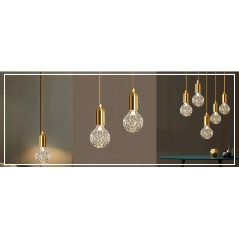 Pendulul este realizat din metal cu finisaj auriu, impreuna cu suportul pentru tavan, iar globul este din sticla transparenta.