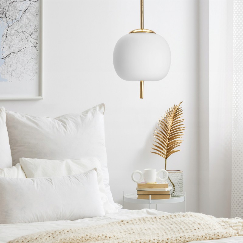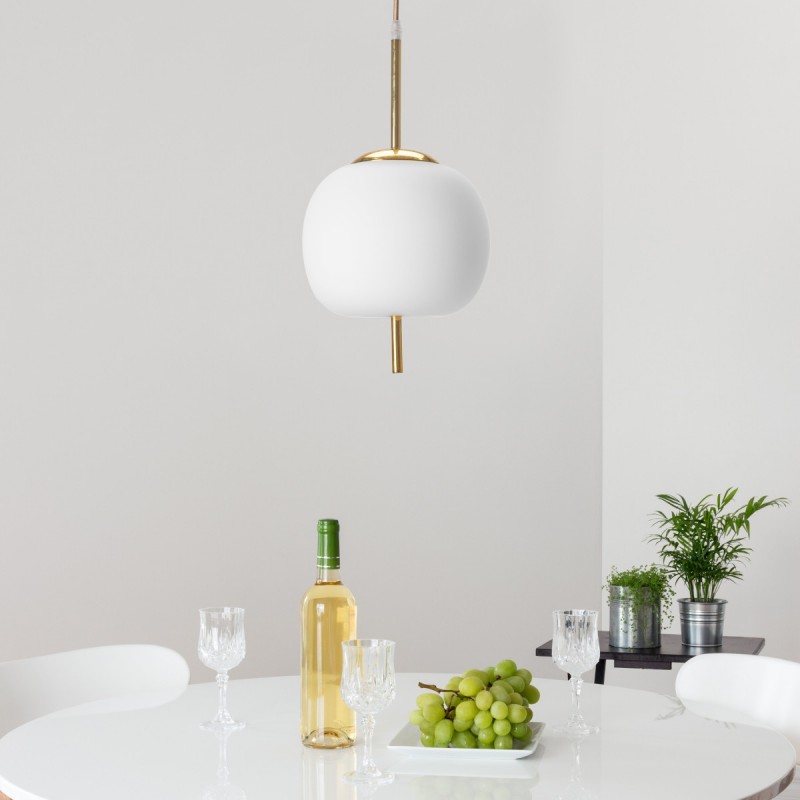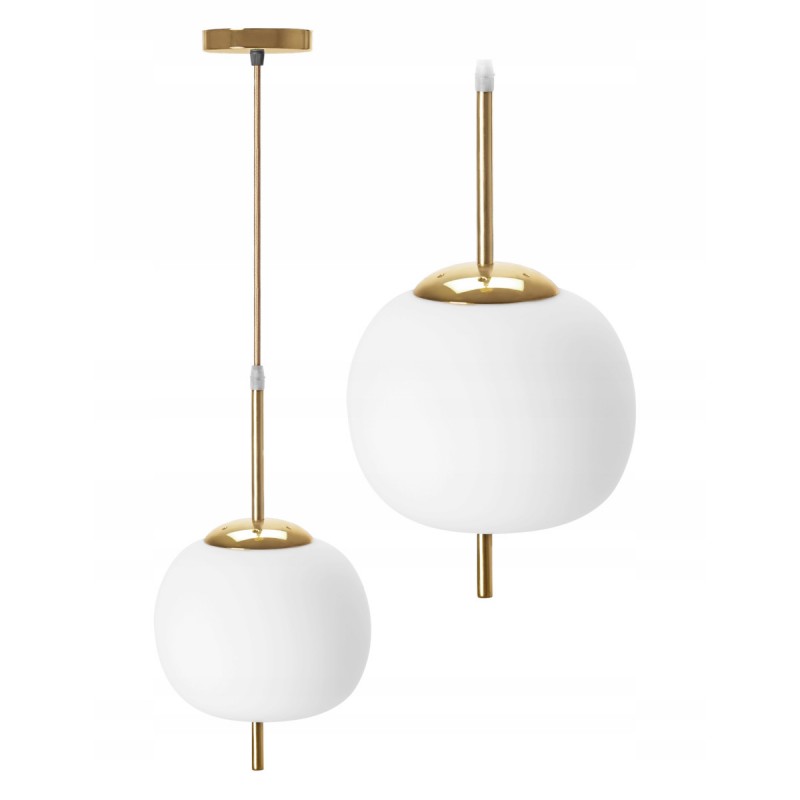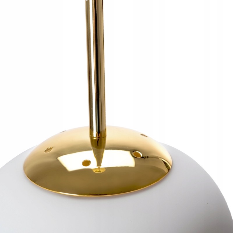 Pendulul este realizat in intregime din metal cu finisaj auriu si globul din sticla de culoare alba. Accentul auriu, ofera lampii o atmosfera unica, care se va potrivi in aproape orice aranjament. Stilul modern face ca lampa sa se potriveasca in orice camera - atat in baie, sufragerie, dormitor sau hol.