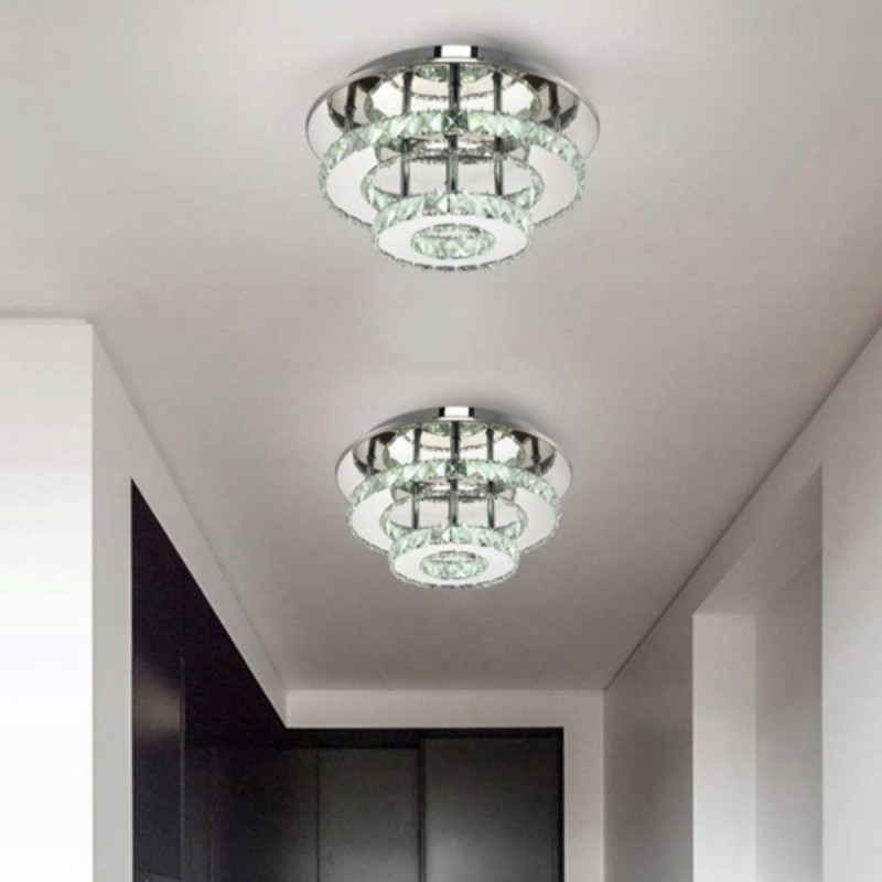 Plafoniera este realizata din metal cu finisaj argintiu si elemente de sticla cristal, avand un suport metalic de tavan.