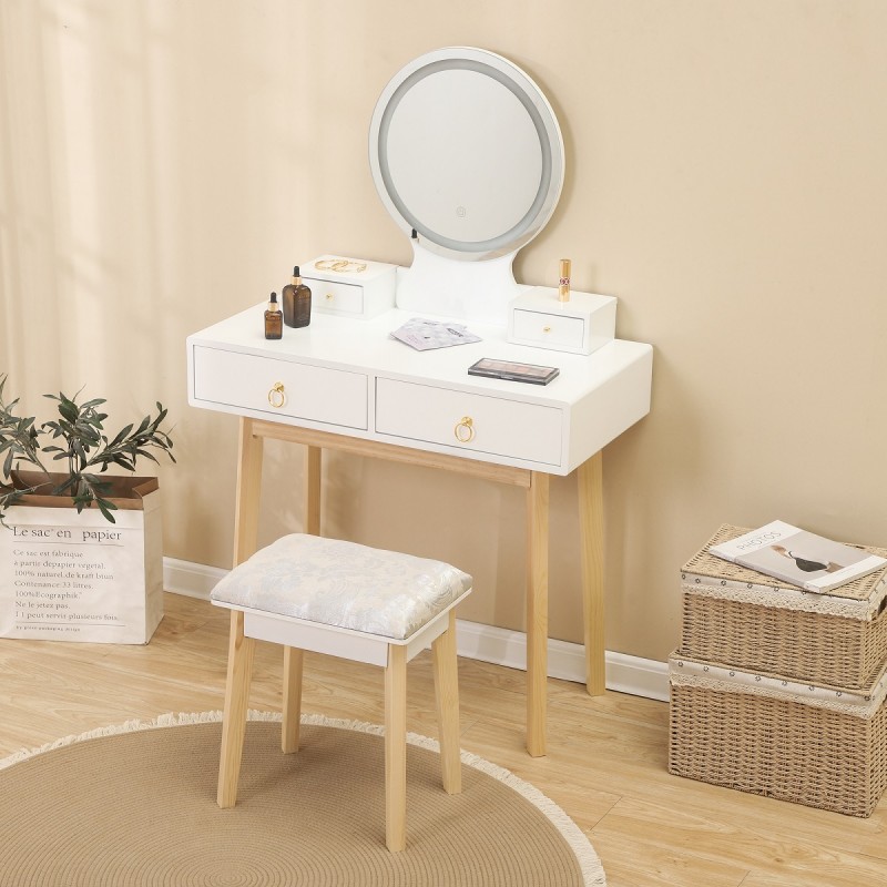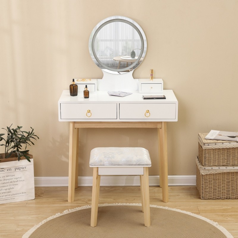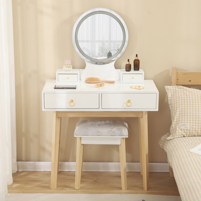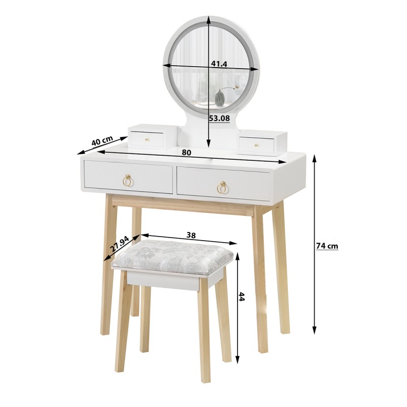 Masa de toaleta, buton touch, iluminare cu banda led, Mdf vopsit, 4 sertare, scaun inclus, 3 tipuri de lumina, Riana
