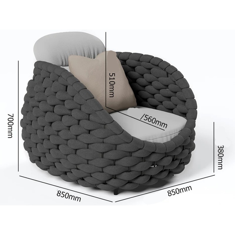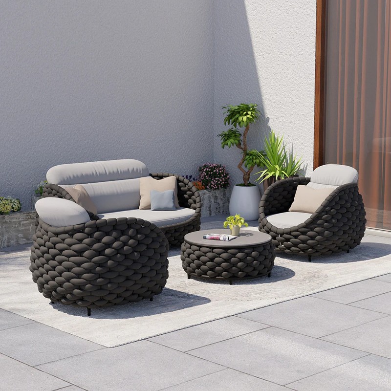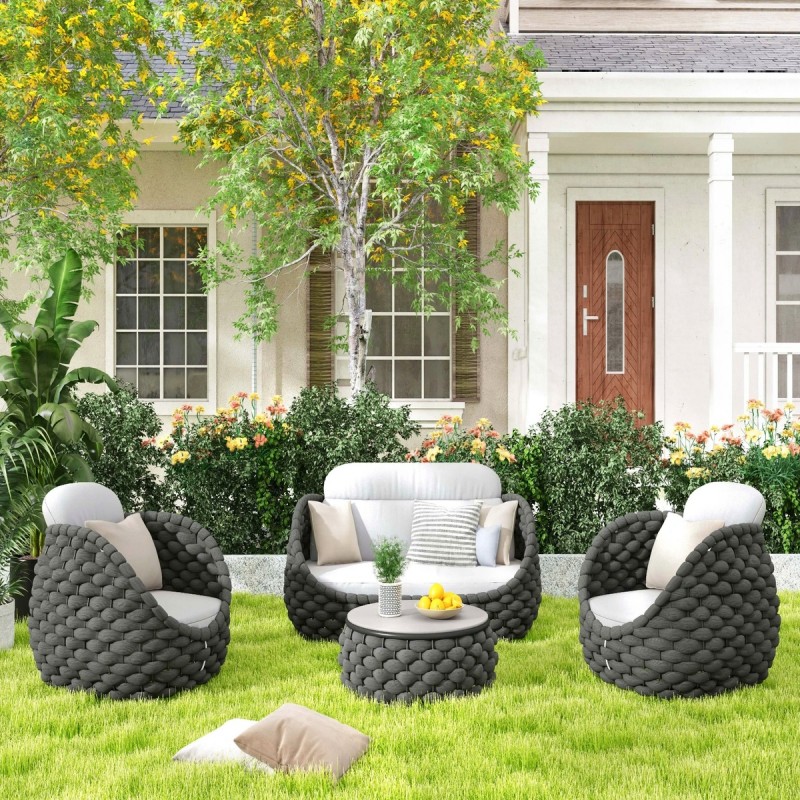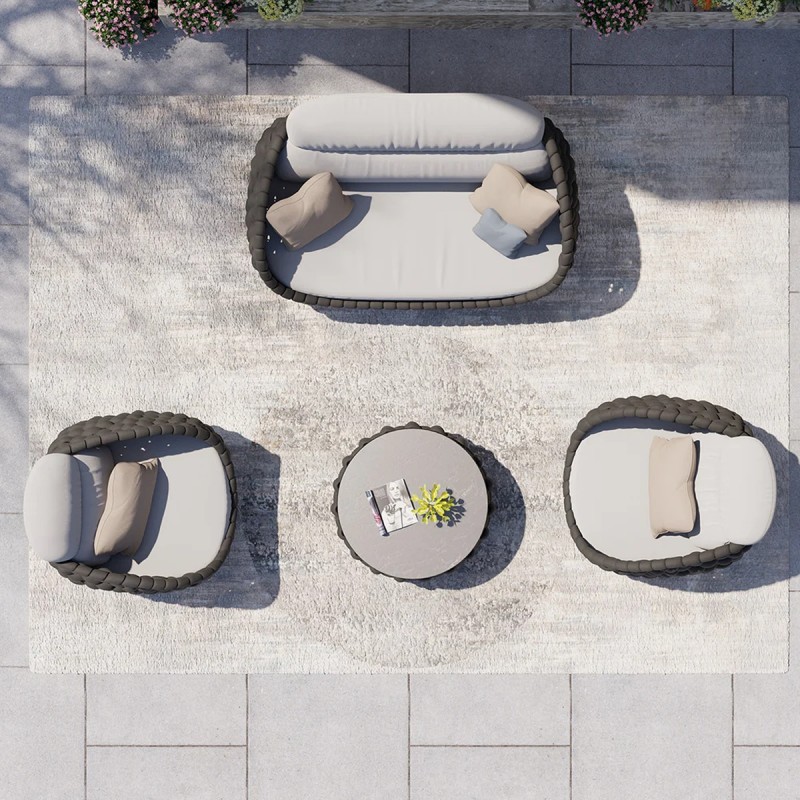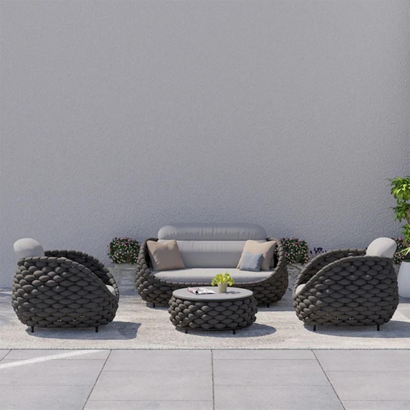 Durabilitate: Constructia din aluminiu si impletitura tip funie groasa asigura rezistenta indelungata impotriva conditiilor meteo, mentinand aspectul estetic al setului.