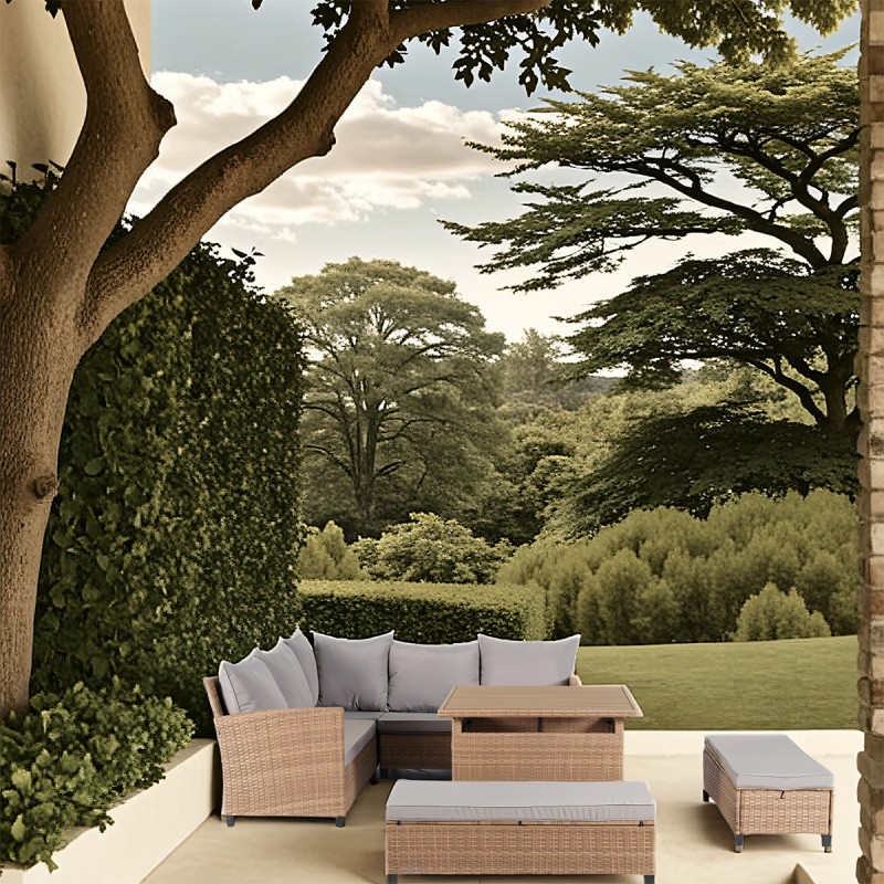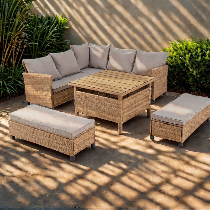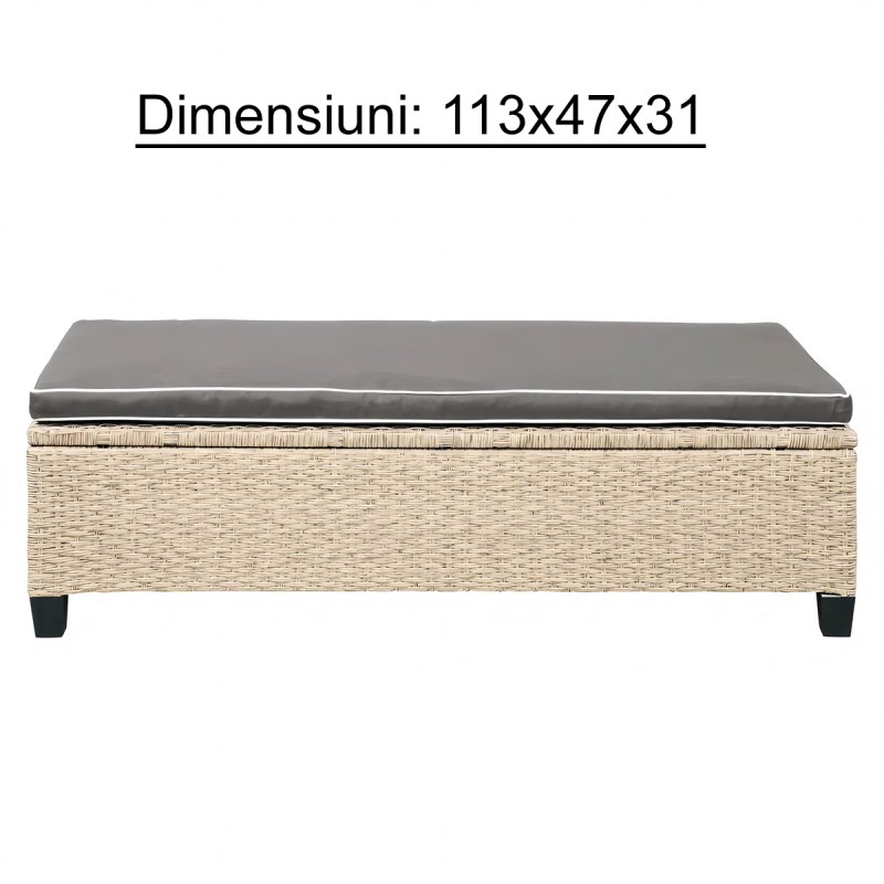 Design elegant si versatil – Combinatia dintre ratanul crem si pernele gri se potriveste perfect in orice decor exterior, adaugand un plus de stil si rafinament gradinii, terasei sau balconului dvs.