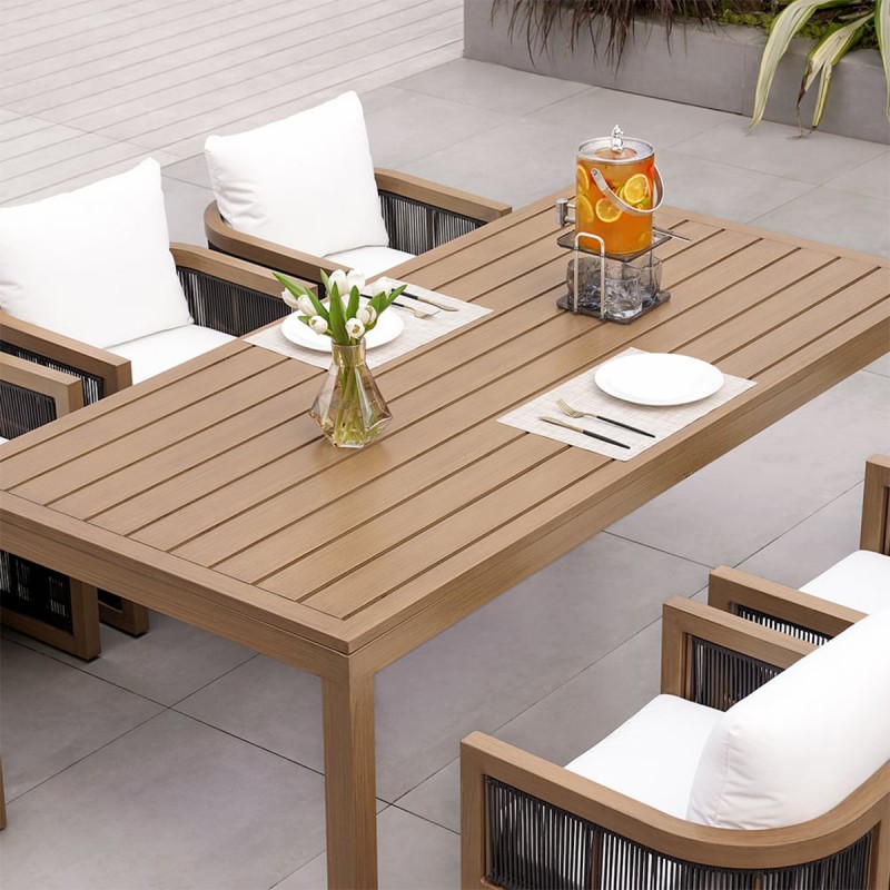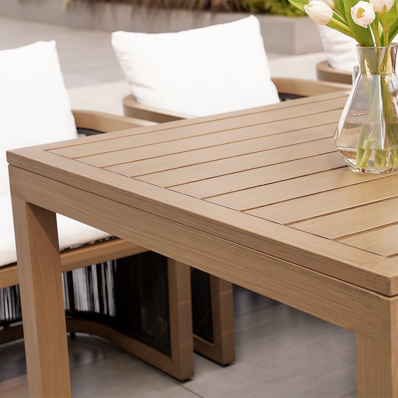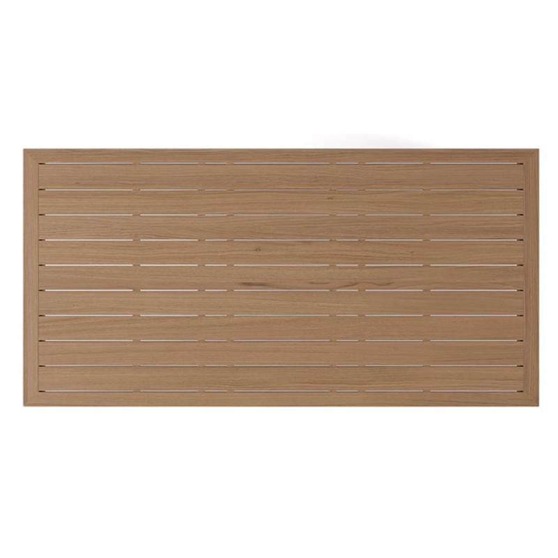Masa are dimensiunile de 150 x 90 x 75 cm, fiind perfecta pentru pana la 6 persoane. Cadrul solid si blatul format din lamele late de tec ofera nu doar stabilitate excelenta, ci si o suprafata usor de intretinut. Lemnul de tec se remarca prin textura sa distinctiva si rezistenta deosebita, conferind mesei un aspect nobil si natural, ce devine centrul atentiei in orice spatiu exterior.