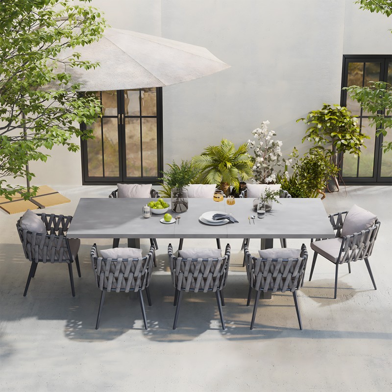 Set mobilier terasa sau gradina, 8 scaune, masa extensibila, aluminiu si impletitura tip funie, Riga